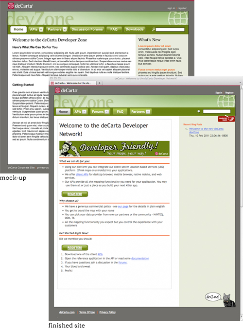 Web site mock-up for deCarta devZone. I was tasked with creating the developer site that still had elements of the main site, but not exactly the same and with some fun elements. I used some of the colors from the deCarta brand and some of the elements from the main page, but added a few other elements. Once the design was finalized, files were handed off to an outside team for development.